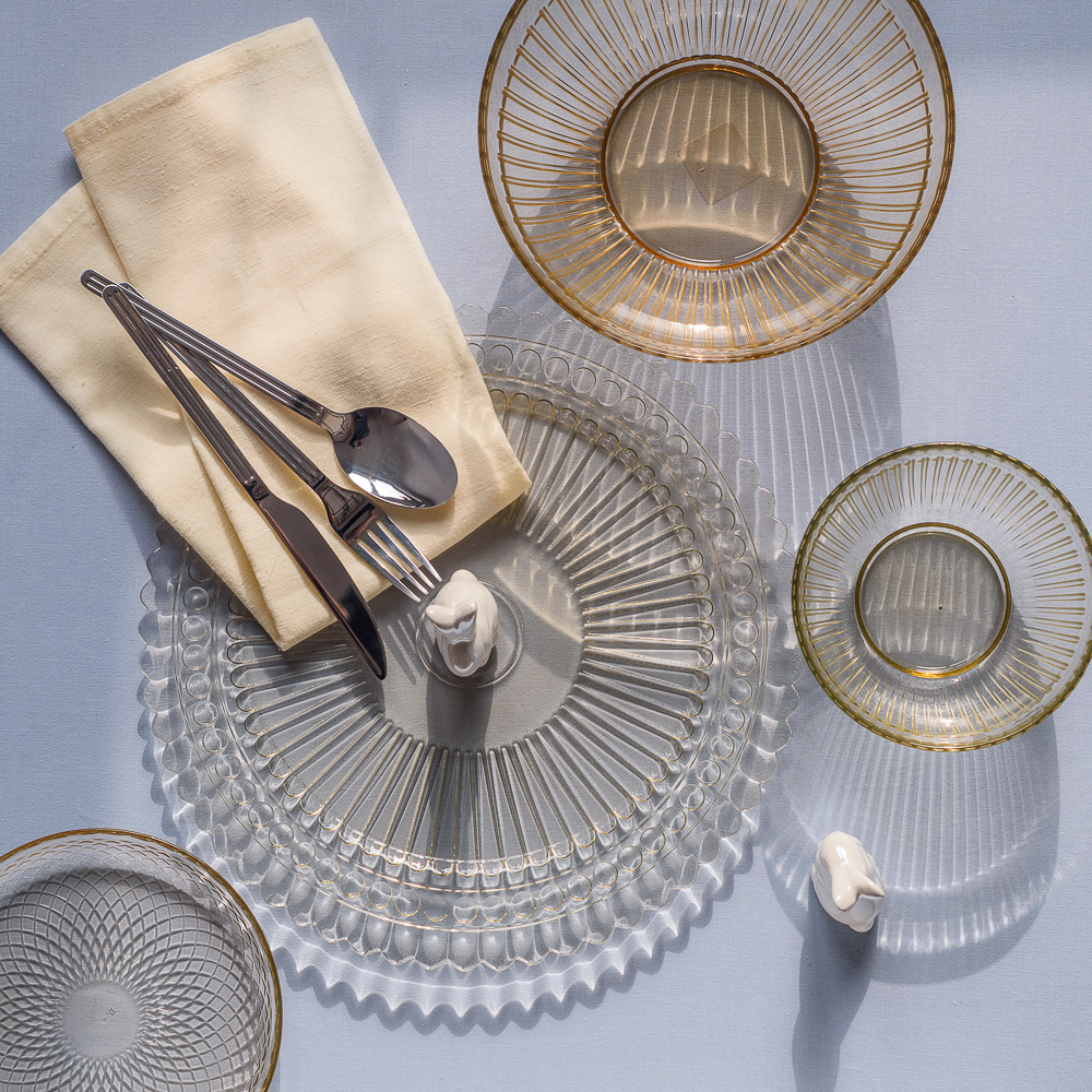 Transparentne szkło w tej tonacji działa niemal jak filtr dla światła. Promienie słońca przechodząc przez jego powierzchnię tworzą miękkie refleksy o miodowym, złocistym charakterze. W efekcie nawet zwykły stół potrafi nabrać wyjątkowego klimatu.