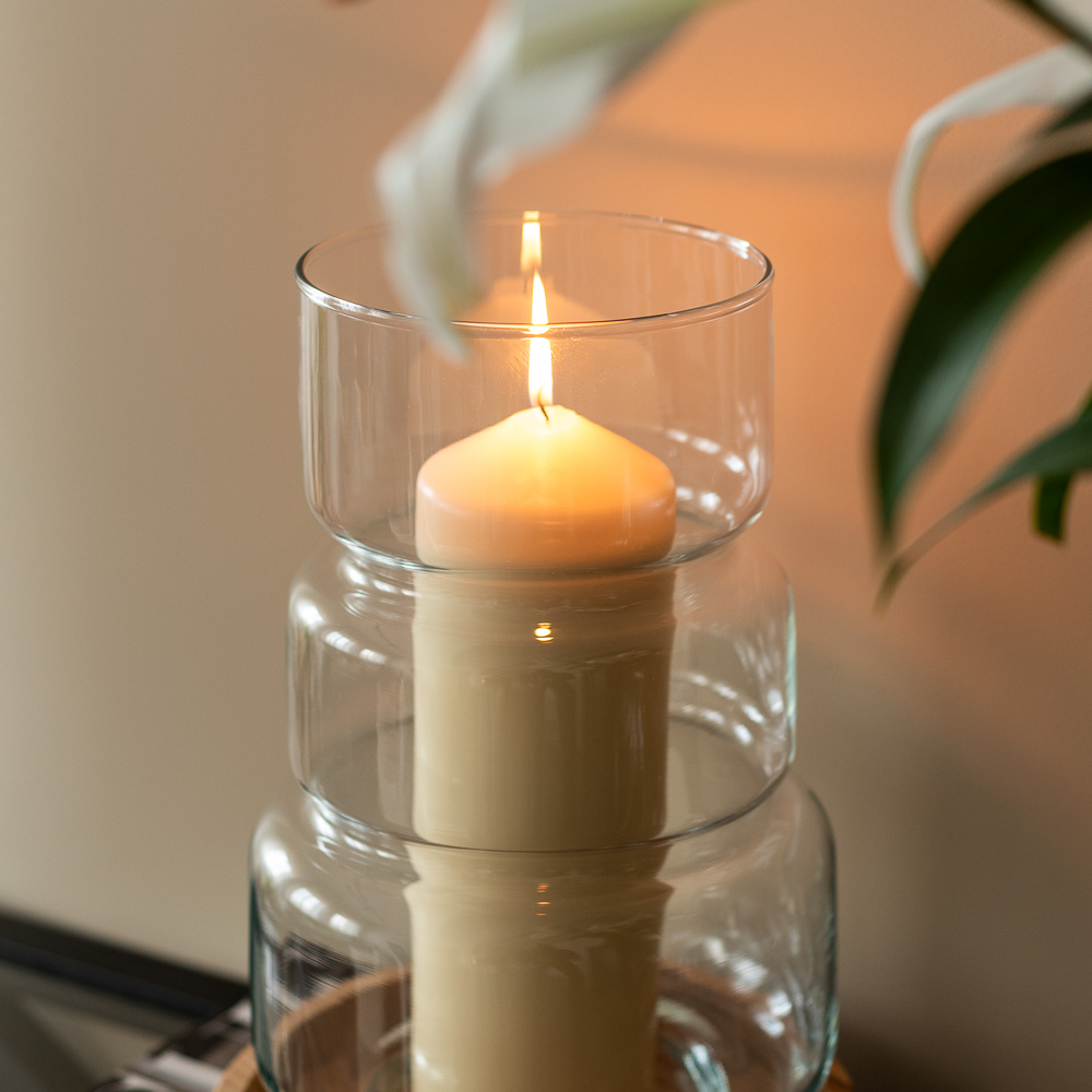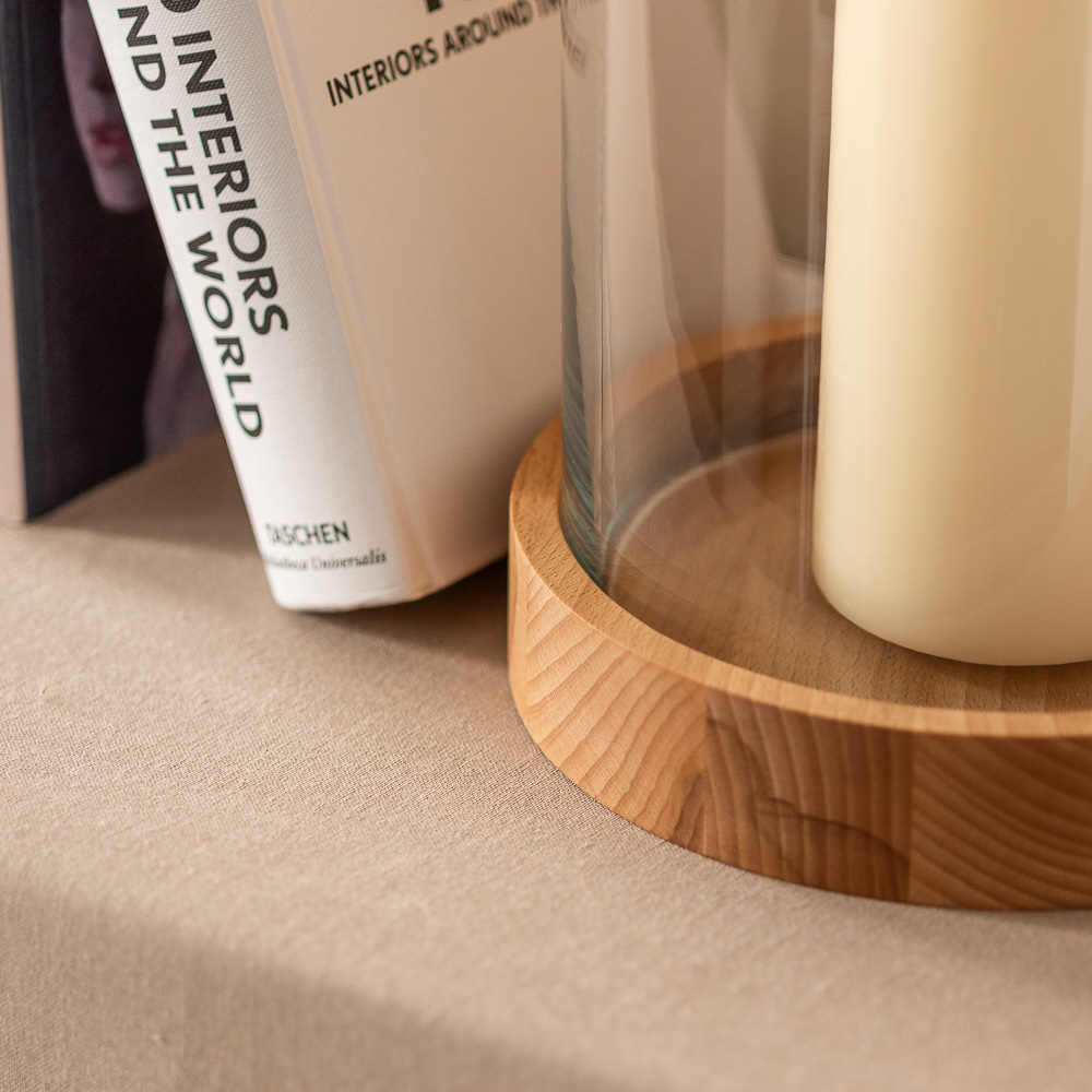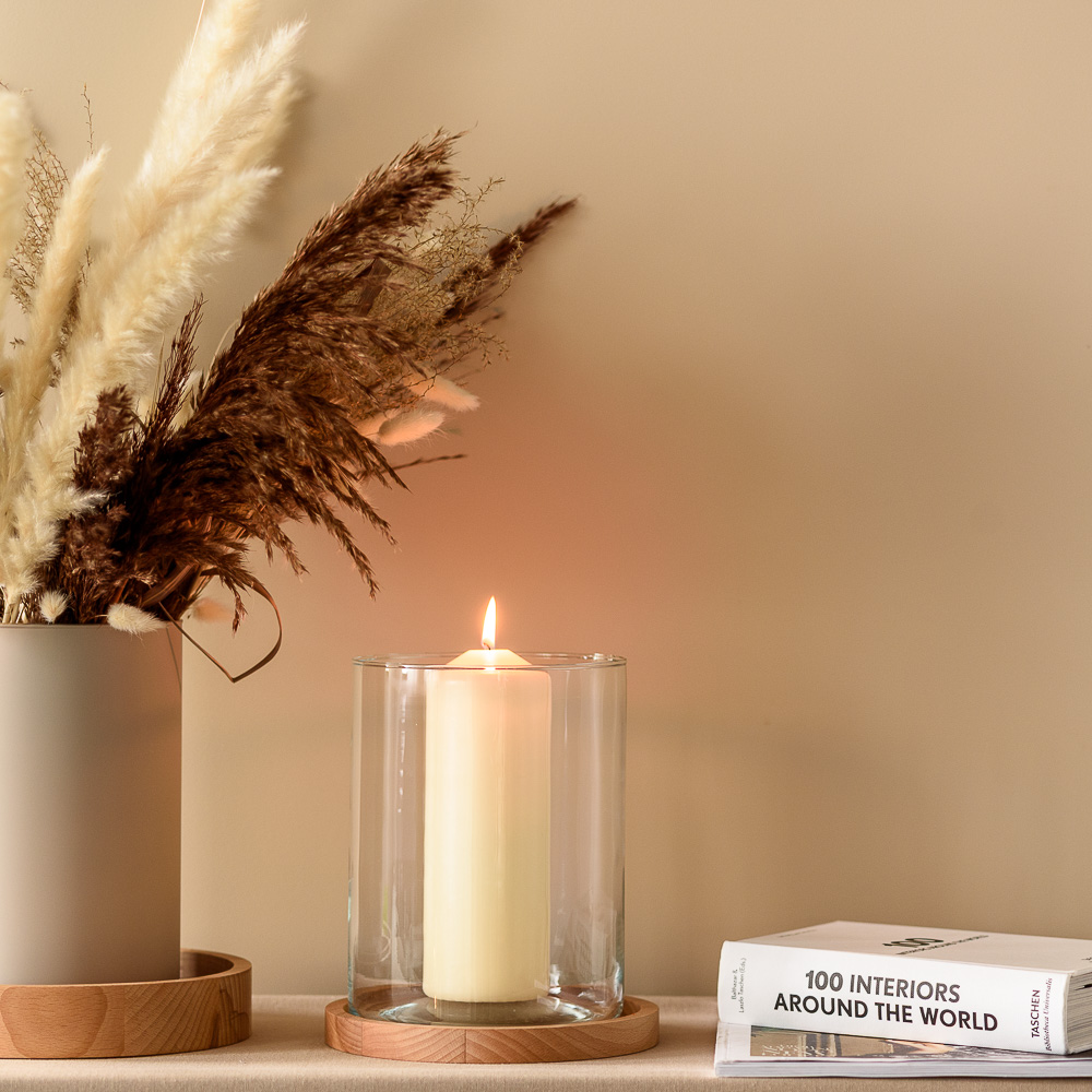 Świecznik szklany cylinder H15 z drewnianą podstawką H1,8