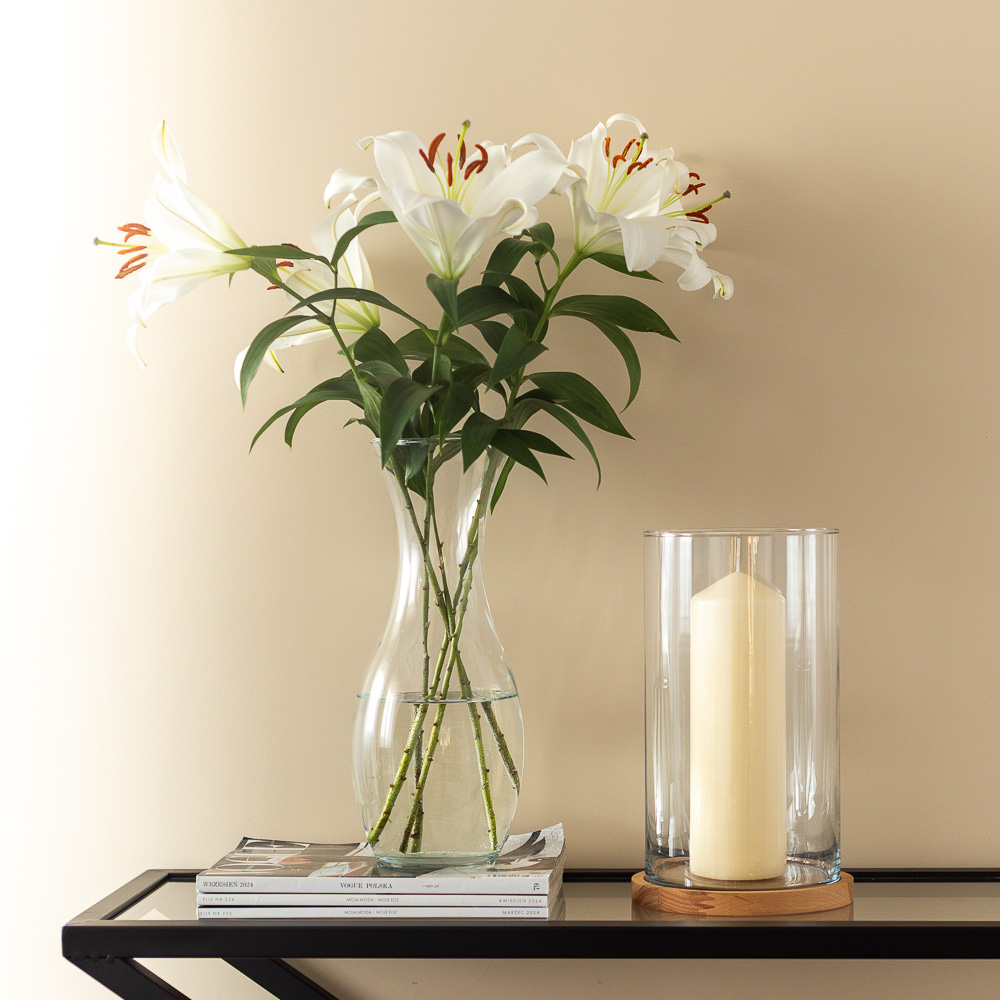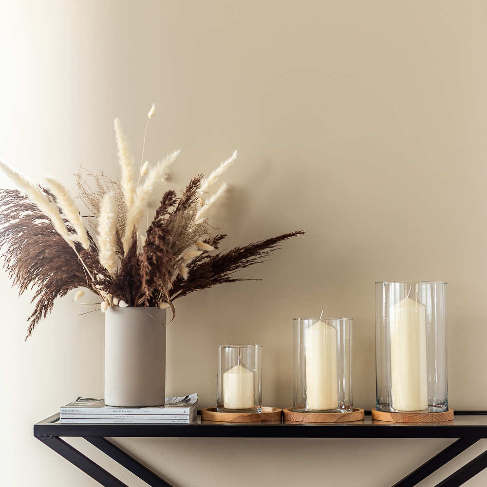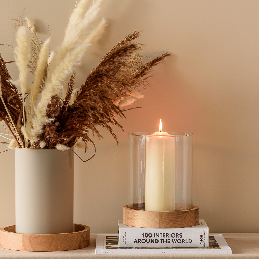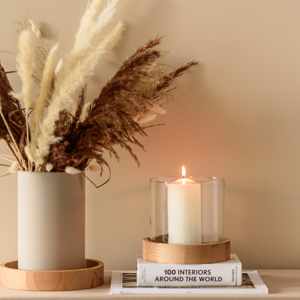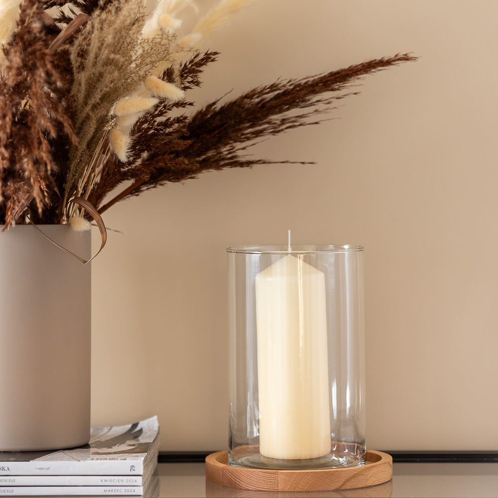 Świecznik szklany wazon cylinder H30 z drewnianą podstawką