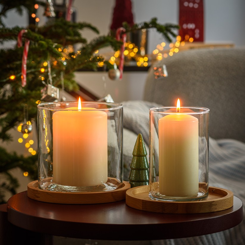 Zestaw świeczników cylindrów szklanych 30-21-15 cm z drewnianą podstawką
