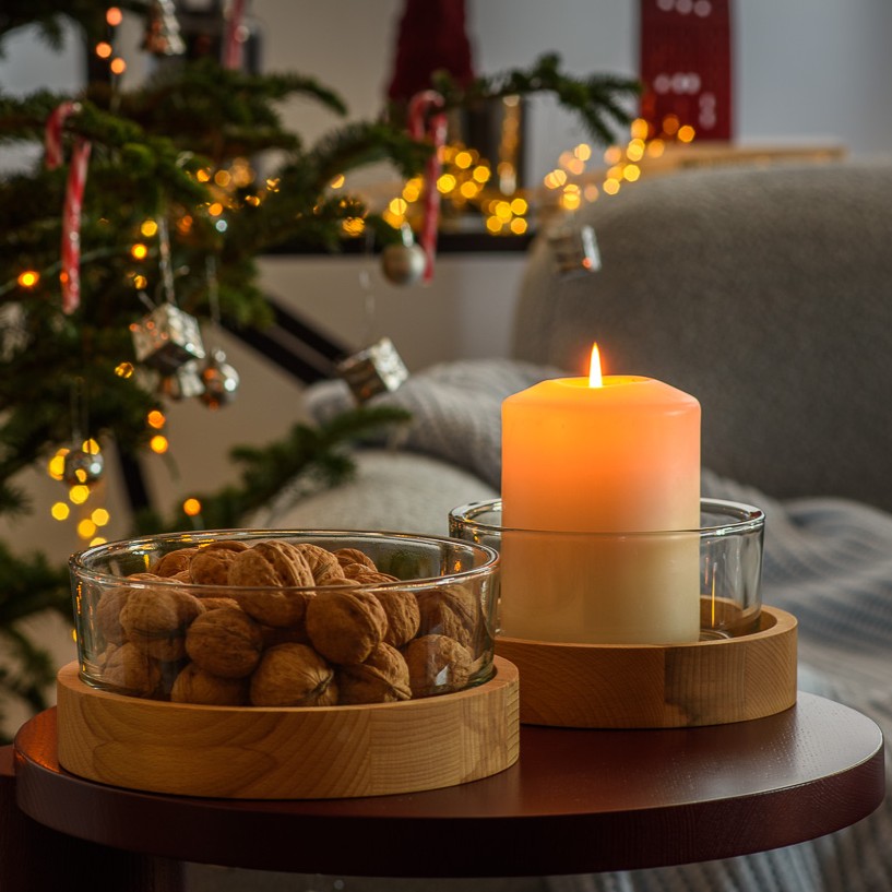 Świecznik szklany misa szer. 15 cm z drewnianą podstawką
