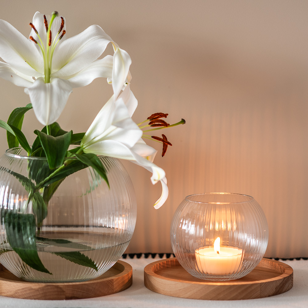 Świecznik szklany kula D8 ryflowana z drewnianą podstawką