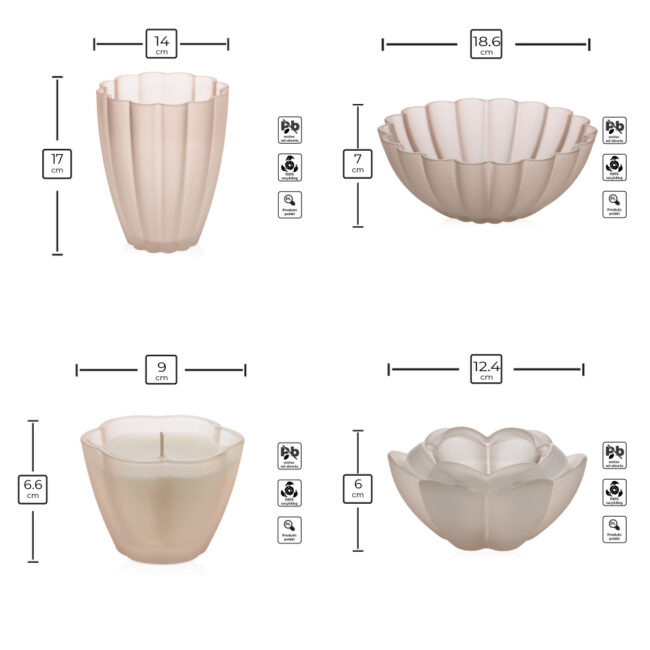 Satynowe wykończenie w delikatnym odcieniu perłowym pięknie rozprasza światło i sprawia, że każdy element prezentownika nabiera miękkiego, eleganckiego charakteru. Wazon w designerskiej formie może pełnić funkcję samodzielnej dekoracji – postawiony na konsoli czy stoliku kawowym stanie się przyciągającym wzrok detalem. Misa doda stołowi wyrafinowania, niezależnie od tego, czy wypełnisz ją owocami, czy pozostanie pustą, czysto dekoracyjną formą. Świecznik w kształcie kwiatu i szklana świeca zapachowa dopełniają całości, tworząc przytulny, nastrojowy klimat w każdym wnętrzu.