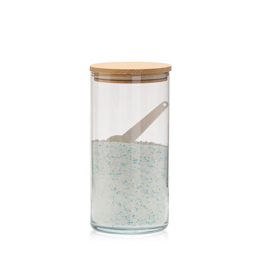 Transparentne szkło wprowadza lekkość i harmonię, a jego prosty, cylindryczny kształt sprawia, że pojemniki świetnie prezentują się zarówno na otwartych półkach, jak i w szafkach. Przechowywanie detergentów w szkle to nie tylko porządek, ale też świadomy wybór estetyczny.