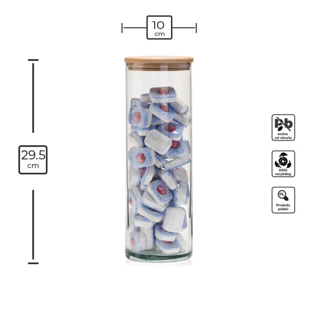 Praktyczny i elegancki, wysoki szklany pojemnik z drewnianym deklem to idealne rozwiązanie do organizacji przestrzeni w łazience i pralni.