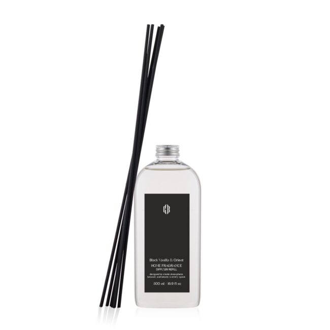 Stwórz we wnętrzu wyjątkową atmosferę dzięki zestawowi: refil zapachowy Black Vanilla & Orient 0,5 l oraz czarne patyczki o długości 48 cm.