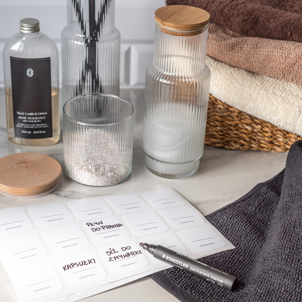Aby jeszcze lepiej zorganizować przestrzeń, pojemnik możesz uzupełnić o etykiety do samodzielnego uzupełnienia.