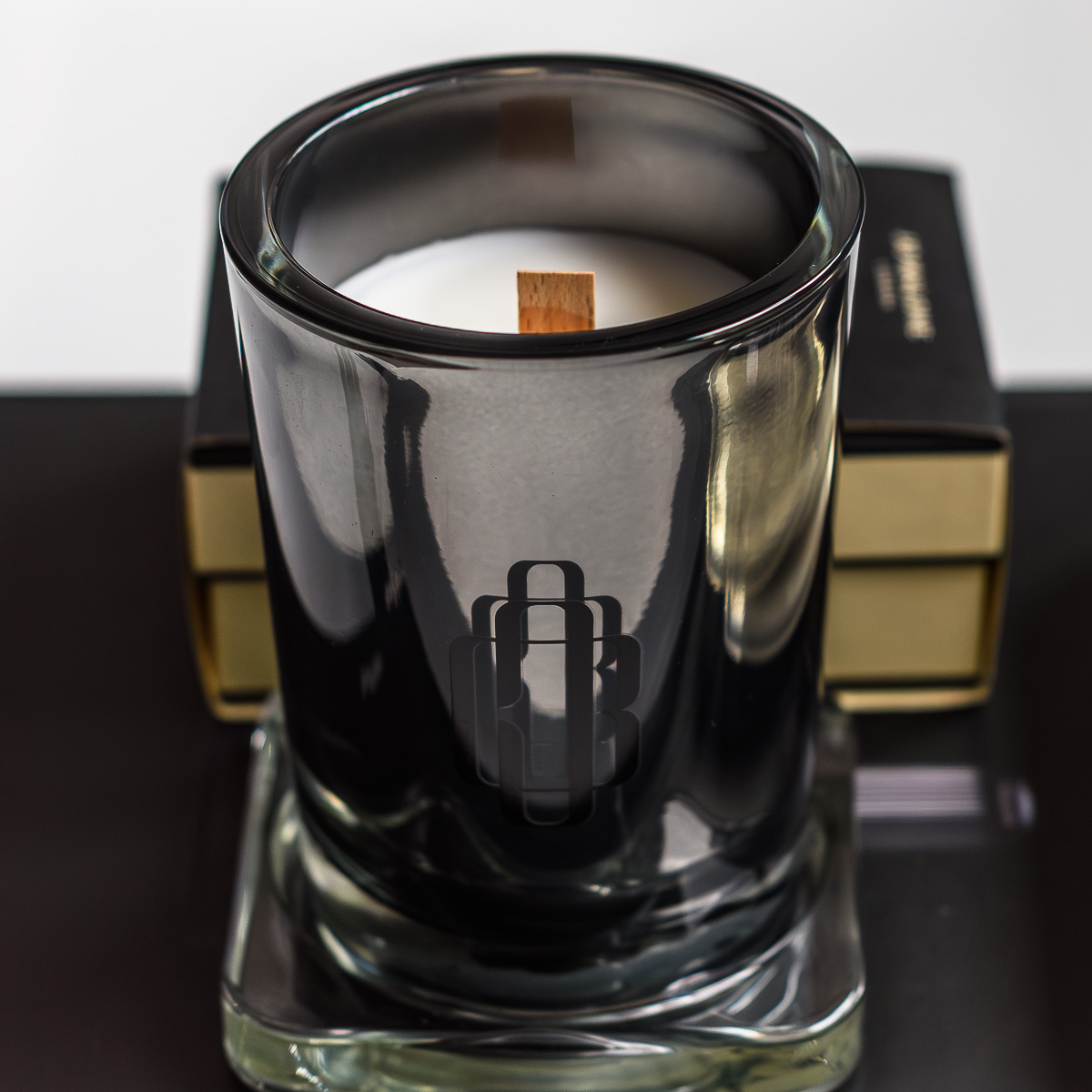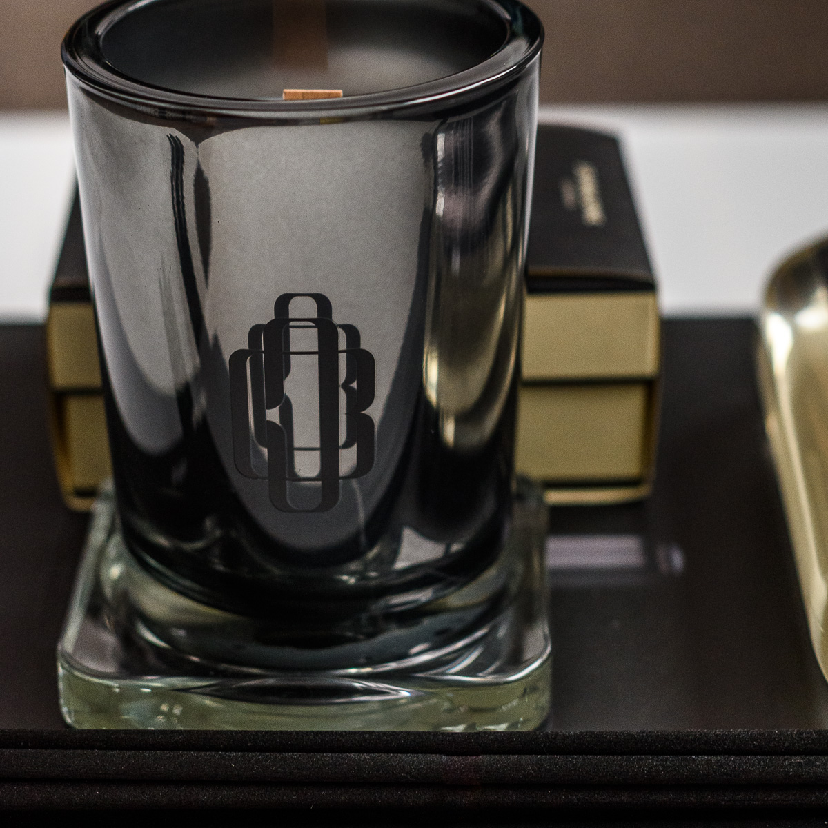 Na froncie szkła znajduje się eleganckie logo, które podkreśla ekskluzywny charakter produktu i sprawia, że świeca staje się luksusowym elementem wystroju wnętrza.