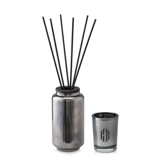 W zestawie znajduje się designerski, ryflowany szklany pojemnik pełniący funkcję dyfuzora zapachowego z czarnymi patyczkami, dopasowany dekiel z otworem oraz refil zapachowy Black Vanilla & Orient o głębokiej, zmysłowej kompozycji nut zapachowych. Całość uzupełnia elegancka świeca zapachowa w tym samym aromacie.