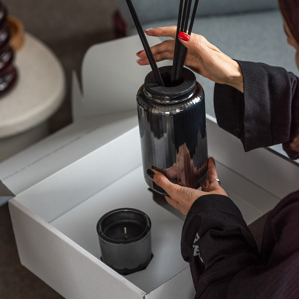 Zestaw Black Vanilla to idealny akcent dekoracyjny do salonu, sypialni, łazienki lub gabinetu. Metalizowane szkło pięknie odbija światło, tworząc subtelne refleksy i dodając wnętrzu głębi. Doskonale komponuje się z jasnymi przestrzeniami jako kontrastowy element, a we wnętrzach ciemniejszych – jako spójna, elegancka forma.