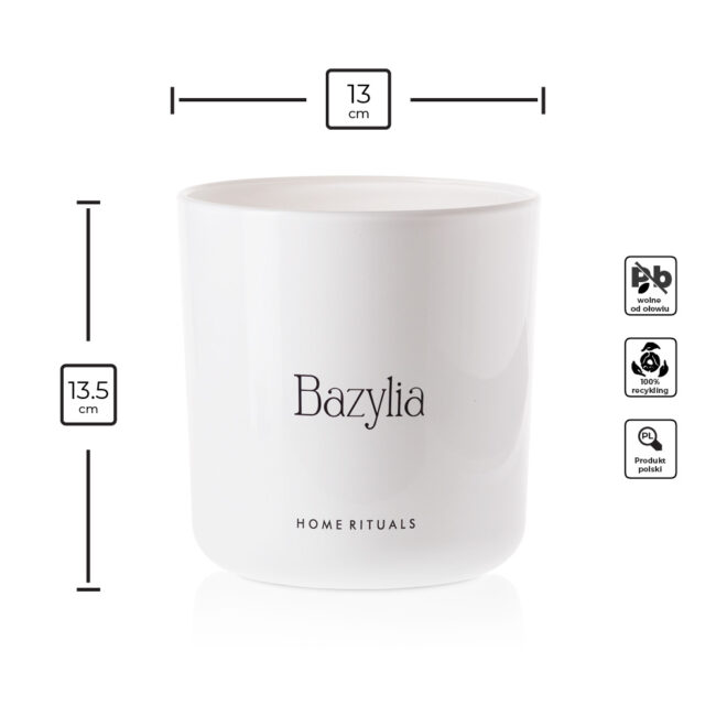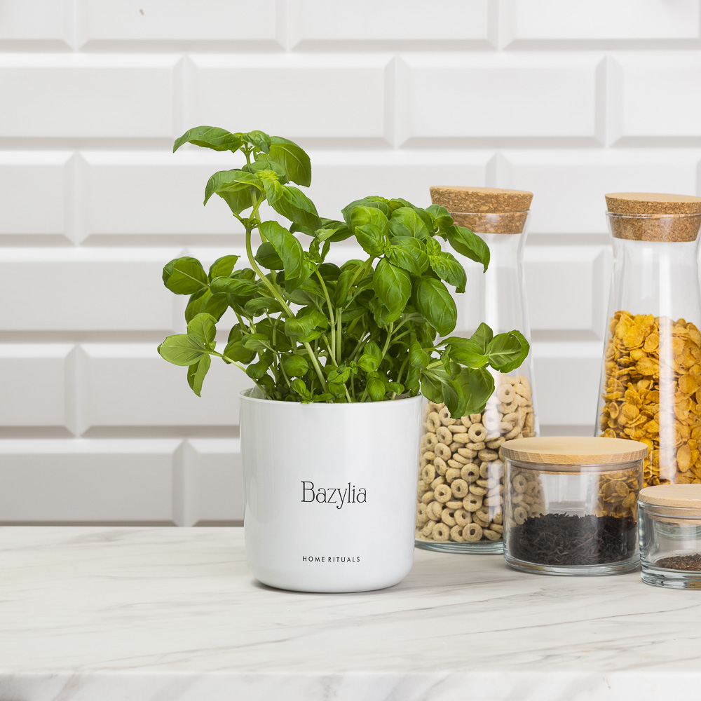 Doniczka osłonka biała z czarnym napisem Bazylia 13cm