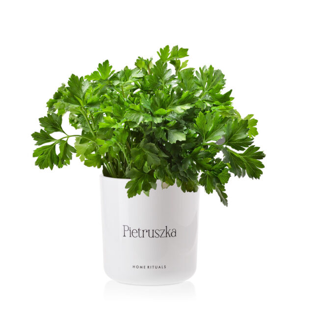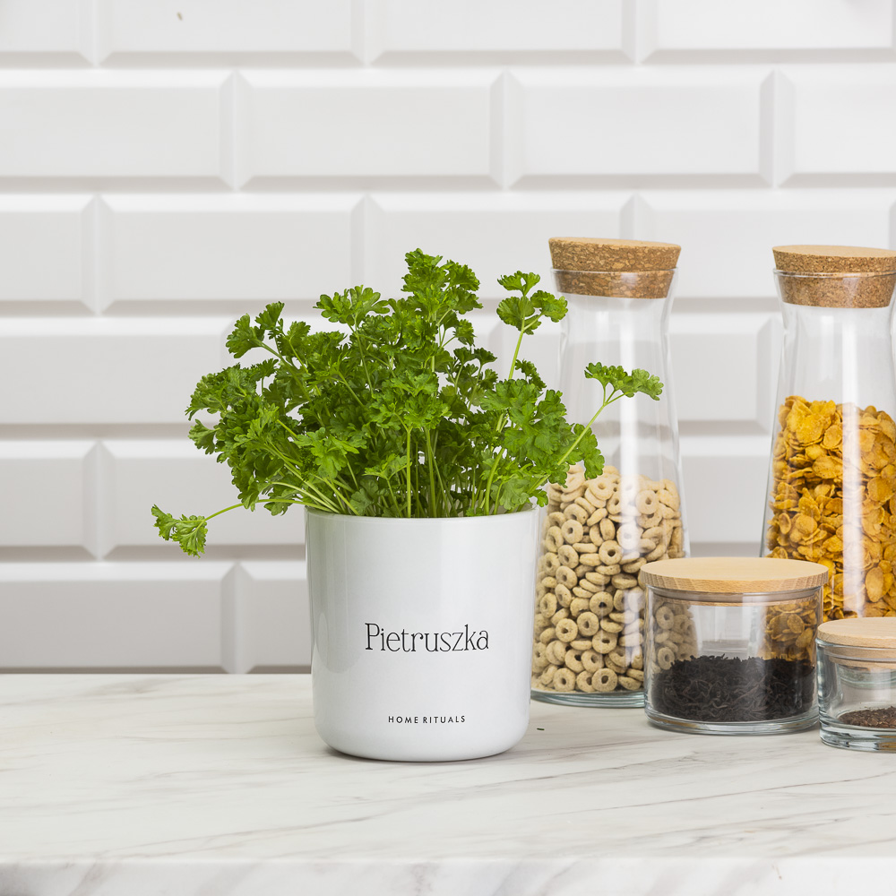 Doniczka osłonka biała z czarnym napisem Pietruszka 13cm