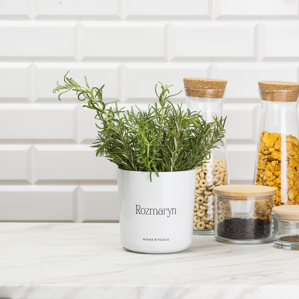 Doniczka osłonka biała z czarnym napisem Rozmaryn 13cm