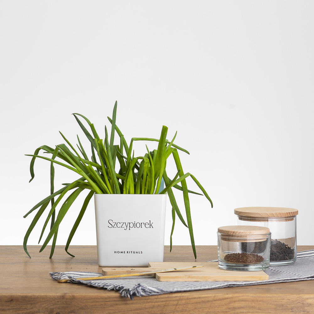 Doniczka na zioła w białym połysku z subtelnym czarnym napisem „Szczypiorek”, jest doskonałym połączeniem elegancji i funkcjonalności, które świetnie wpisuje się w nowoczesne i minimalistyczne wnętrza. Biała błyszcząca powierzchnia doniczki emanuje prostotą, a jej delikatna tekstura nadaje jej przytulny, ale zarazem elegancki charakter. Czarny napis, subtelnie wyeksponowany na frontowej stronie, wprowadza do całości odrobinę luksusu i sprawia, że całość nabiera wyrafinowanego wyrazu.