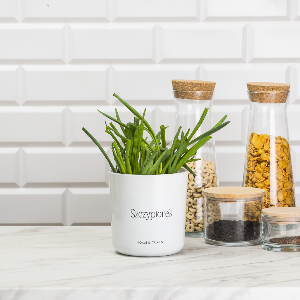 Doniczka osłonka biała z czarnym napisem Szczypiorek 13cm