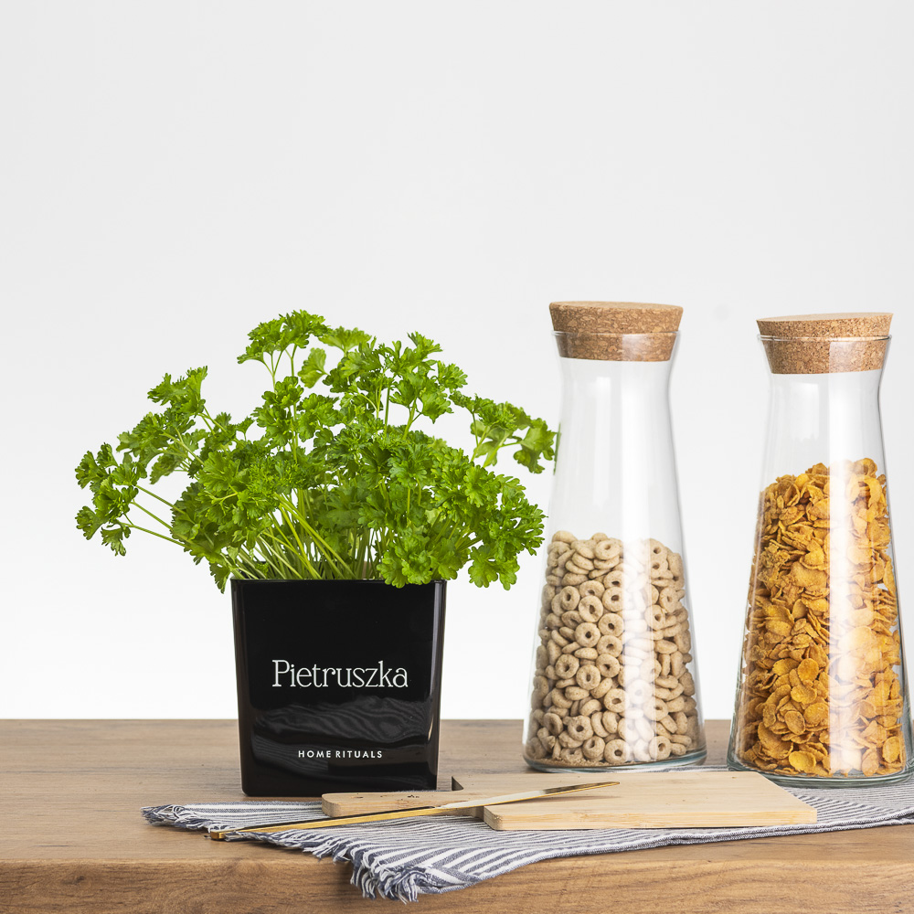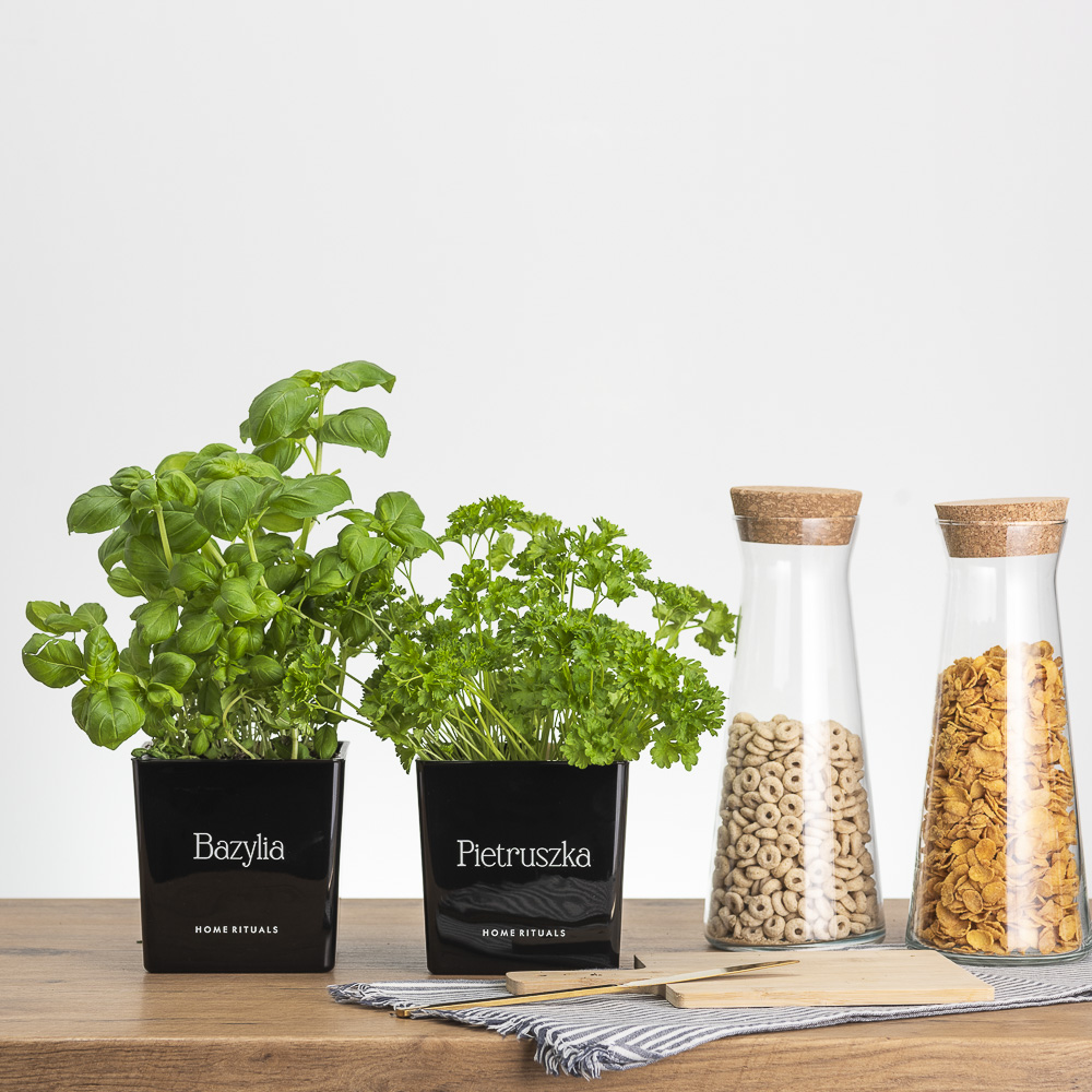 Doniczka na zioła w czarnym połysku, z subtelnym białym napisem „Pietruszka”, jest doskonałym połączeniem elegancji i funkcjonalności, które świetnie wpisuje się w nowoczesne i minimalistyczne wnętrza. Czarna błyszcząca powierzchnia doniczki emanuje prostotą, a jej delikatna tekstura nadaje jej przytulny, ale zarazem elegancki charakter. Biały napis, subtelnie wyeksponowany na frontowej stronie, wprowadza do całości odrobinę luksusu i sprawia, że całość nabiera wyrafinowanego wyrazu.