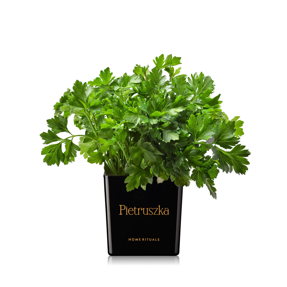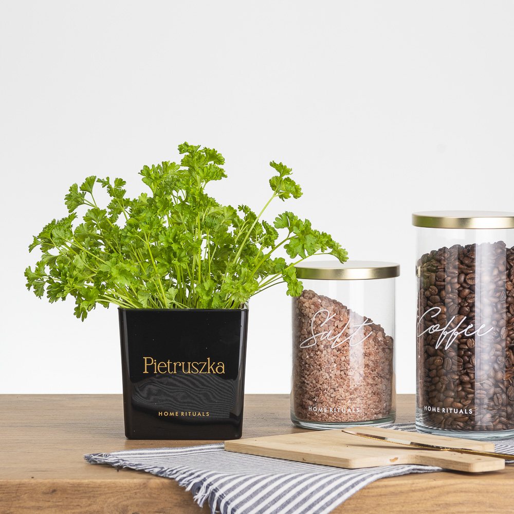 Doniczka na zioła w czarnym połysku, z subtelnym złotym napisem „Pietruszka”, jest doskonałym połączeniem elegancji i funkcjonalności, które świetnie wpisuje się w nowoczesne i minimalistyczne wnętrza. Czarna błyszcząca powierzchnia doniczki emanuje prostotą, a jej delikatna tekstura nadaje jej przytulny, ale zarazem elegancki charakter. Złoty napis, subtelnie wyeksponowany na frontowej stronie, wprowadza do całości odrobinę luksusu i sprawia, że całość nabiera wyrafinowanego wyrazu.