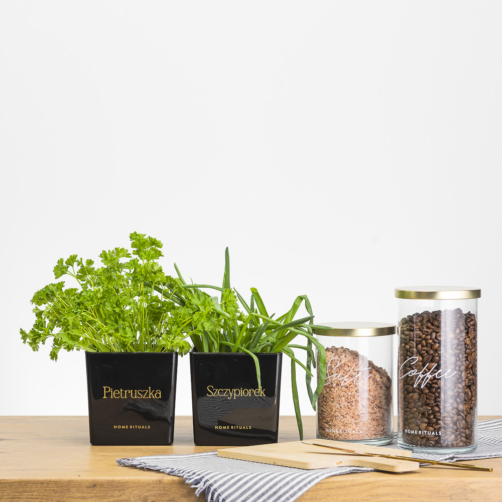 Stylowy napis wykonany metodą sitodruku w kolorze złotym nie tylko dodaje wyjątkowej klasy, ale również ułatwia organizację domowego zielnika, pomagając w estetycznej segregacji ziół.
