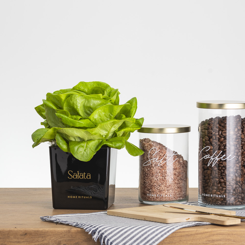 Doniczka na zioła w czarnym połysku, z subtelnym złotym napisem „Sałata”, jest doskonałym połączeniem elegancji i funkcjonalności, które świetnie wpisuje się w nowoczesne i minimalistyczne wnętrza. Czarna błyszcząca powierzchnia doniczki emanuje prostotą, a jej delikatna tekstura nadaje jej przytulny, ale zarazem elegancki charakter. Złoty napis, subtelnie wyeksponowany na frontowej stronie, wprowadza do całości odrobinę luksusu i sprawia, że całość nabiera wyrafinowanego wyrazu.