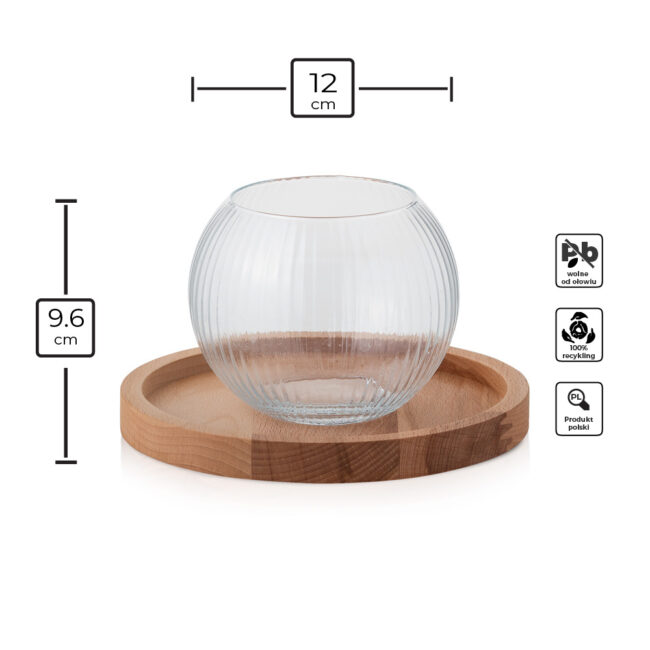 Świecznik szklany kula D8 ryflowana z drewnianą podstawką