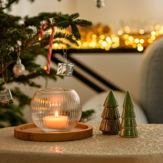 Świecznik w kształcie niskiej kuli o delikatnym, ryflowanym wykończeniu w połączeniu z drewnianą podstawką tworzy harmonijną i stylową całość.