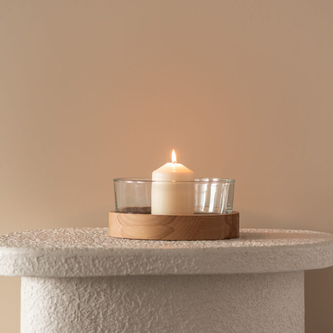 Świecznik szklany z podstawką drewnianą, nr produktu: 30064 Z PODSTA D18,3 H3,8