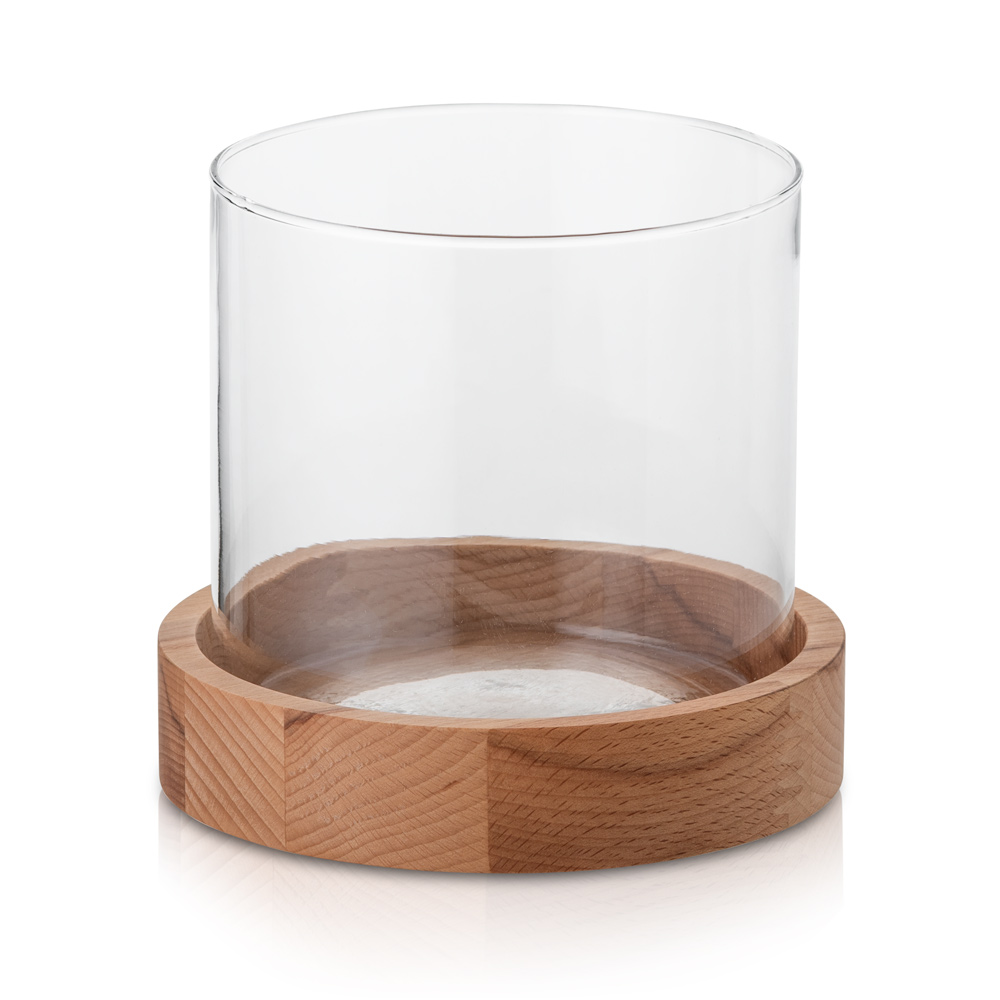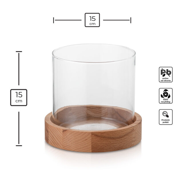 Świecznik szklany wazon cylinder H15 z drewnianą podstawką H3,8