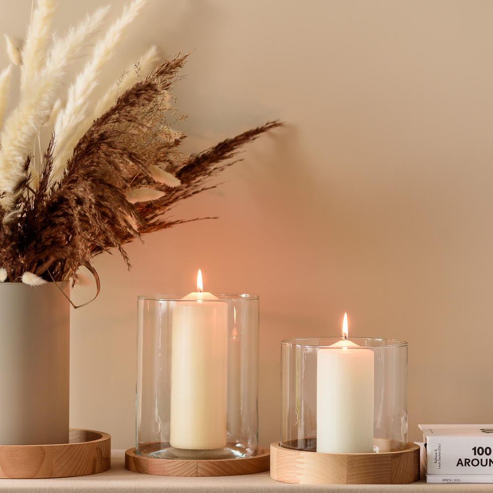 Bukowa podstawa D18 H3,8 dodaje kompozycji ciepła i stabilności, dzięki czemu zestaw sprawdzi się na stole, komodzie, parapecie czy jako część dekoracji eventowej.