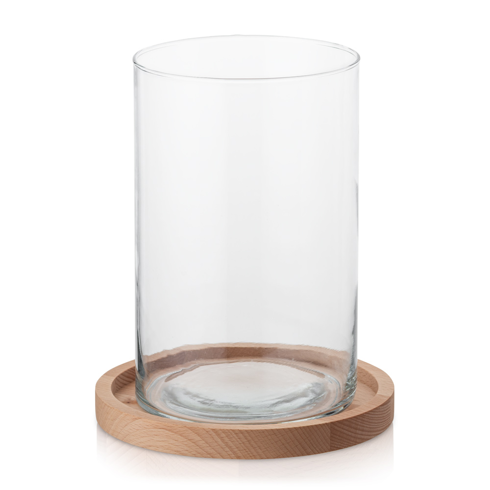 Świecznik szklany wazon cylinder H21,5 z drewnianą podstawką