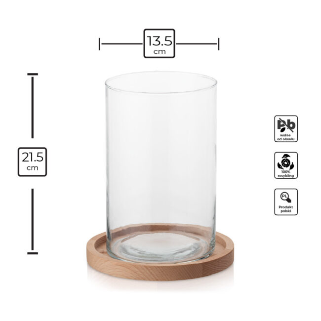 Cylinder szklany w połączeniu z bukową podstawką to doskonały duet, który odnajdzie się zarówno w klasycznych, jak i nowoczesnych aranżacjach.