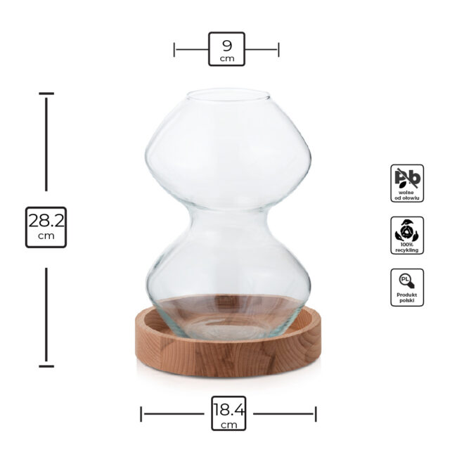 Drewniana podstawka z buku o średnicy 20,8 cm dopełnia całość – dodaje ciepła, stabilności i podkreśla naturalne piękno szkła.