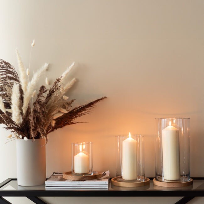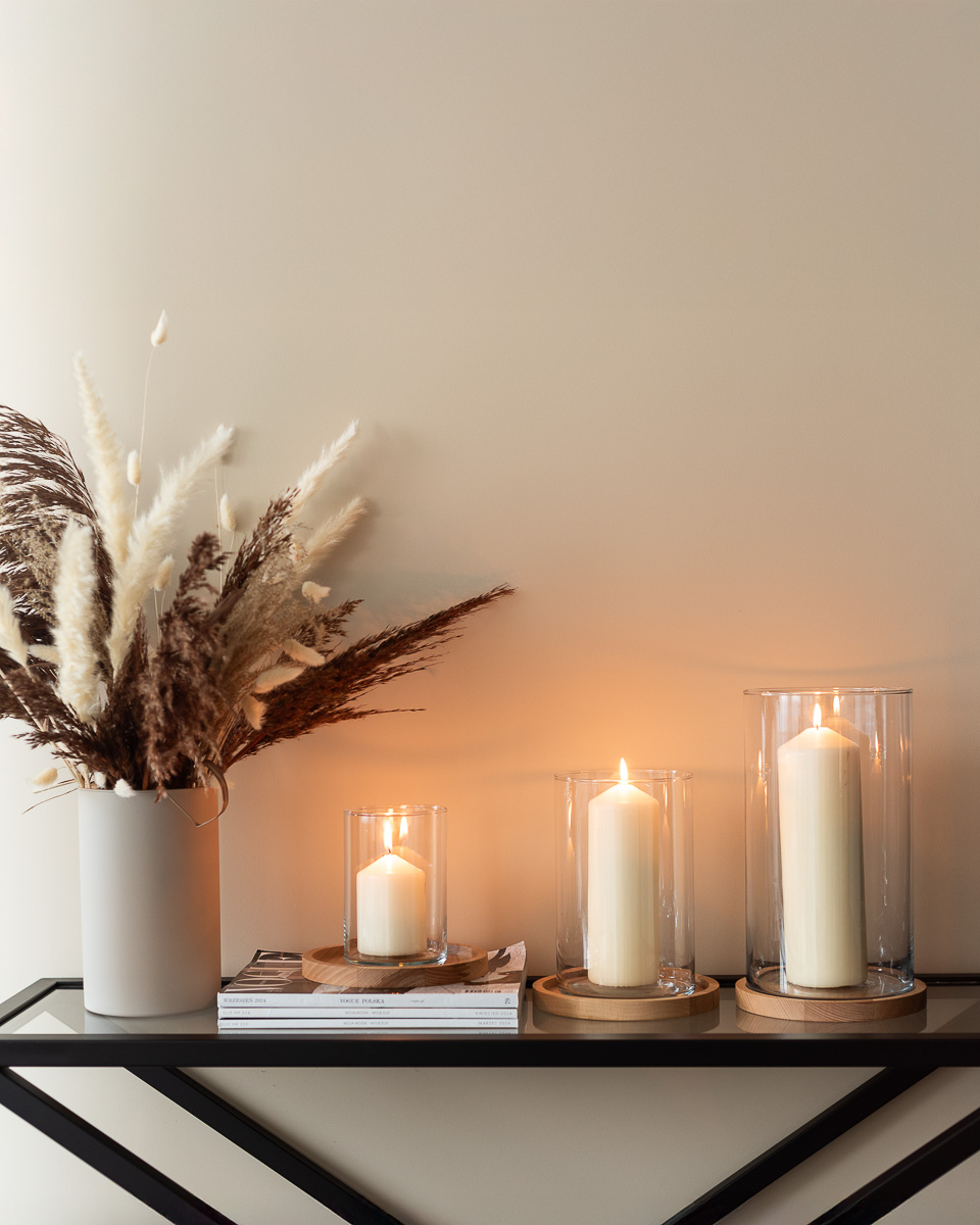 Zestaw trzech cylindrów z podstawkami to klasyka w nowoczesnym wydaniu. Drewniane elementy dodają całości przytulności, a transparentne szkło wprowadza lekkość i elegancję. Różne wysokości świeczników/wazonów pozwalają na tworzenie efektownych, zróżnicowanych kompozycji — od delikatnych aranżacji stołowych po rozbudowane dekoracje sal i eventów.