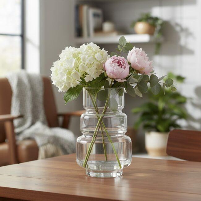 Wazon ten to świetny wybór do nowoczesnych aranżacji – jego wyraźnie zarysowana bryła wprowadza do przestrzeni porządek i rytm. Dzięki wyważonym proporcjom dobrze prezentuje się zarówno w pojedynkę, jak i jako część większej kompozycji np. z innymi wazonami lub naczyniami dekoracyjnymi o podobnym charakterze. Idealny do ekspozycji w strefie dziennej – na stole, komodzie lub szerokim parapecie. Świetnie współgra z prostymi, liniowymi bukietami (np. gałęzie eukaliptusa, trawy, suche kompozycje), ale nie boi się też koloru – klasyczne tulipany lub piwonie będą w nim wyglądać elegancko i świeżo. To uniwersalny „statement piece” z nutą skandynawskiego spokoju i nowoczesnej geometrii.