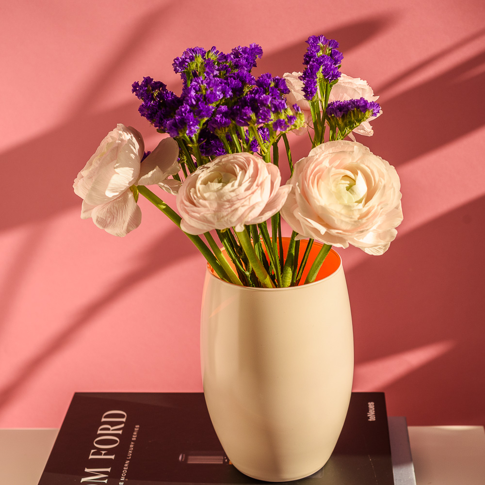 Kremowy wazon z subtelnym pomarańczowym wnętrzem to kwintesencja wiosennej świeżości i elegancji.
