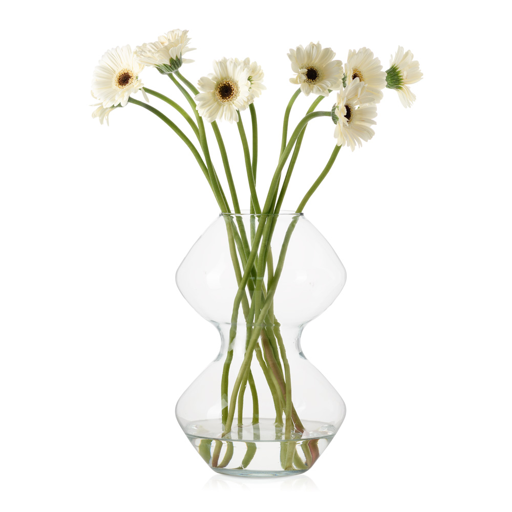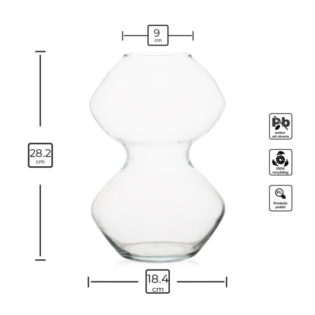 Ten wazon to prawdziwy statement piece – jego dynamiczna forma o podwójnym przeskalowaniu wnosi do wnętrza nutę artyzmu i świeżości. Świetnie sprawdzi się jako solowy akcent na komodzie, konsoli czy stoliku pomocniczym – szczególnie w otoczeniu naturalnych materiałów jak drewno, lnu czy kamienia. Dzięki swojej transparentności nie przytłacza przestrzeni, a jednocześnie przyciąga wzrok i dodaje wnętrzu lekkości. Idealny do stylizacji z wysokimi, pojedynczymi gałązkami lub asymetrycznymi bukietami, które podkreślą jego rzeźbiarski kształt. Polecany do wnętrz w stylu nowoczesnym, soft loft czy boho – tam, gdzie liczy się forma, światło i świadomie dobrane detale.