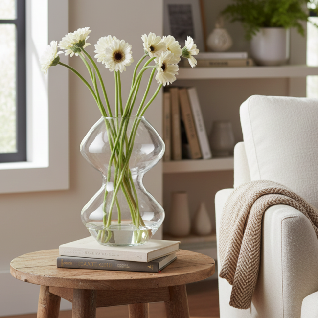 Ten wazon to prawdziwy statement piece – jego dynamiczna forma o podwójnym przeskalowaniu wnosi do wnętrza nutę artyzmu i świeżości. Świetnie sprawdzi się jako solowy akcent na komodzie, konsoli czy stoliku pomocniczym – szczególnie w otoczeniu naturalnych materiałów jak drewno, lnu czy kamienia. Dzięki swojej transparentności nie przytłacza przestrzeni, a jednocześnie przyciąga wzrok i dodaje wnętrzu lekkości. Idealny do stylizacji z wysokimi, pojedynczymi gałązkami lub asymetrycznymi bukietami, które podkreślą jego rzeźbiarski kształt. Polecany do wnętrz w stylu nowoczesnym, soft loft czy boho – tam, gdzie liczy się forma, światło i świadomie dobrane detale.