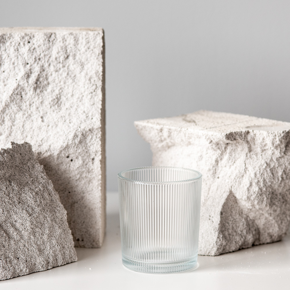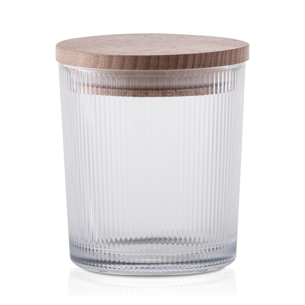 Elegancki pojemnik wykonany z grubego, przezroczystego szkła o wyjątkowym, ryflowanym designie.