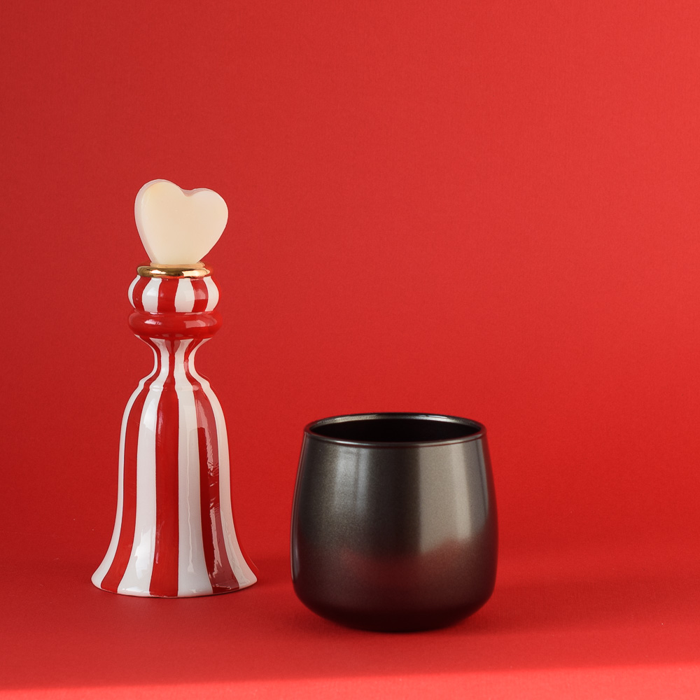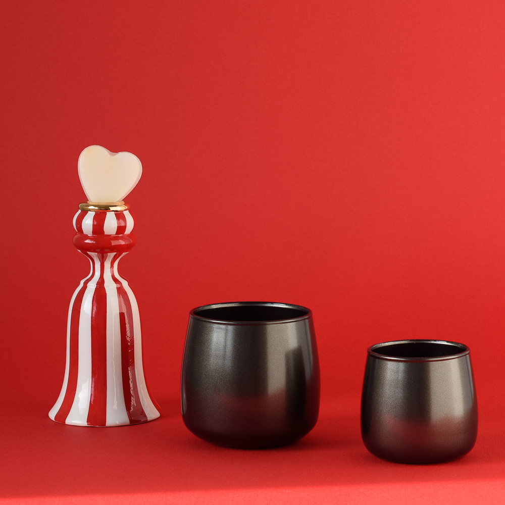 Wykonany z dbałością o każdy szczegół, pojemnik w czarnym metaliku zachwyca swoim lśniącym blaskiem i wyrafinowanym designem. Stanowi doskonałą bazę dla świec, które mają być nie tylko źródłem światła, ale i ozdobą wnętrza. Jego luksusowy wygląd wpisuje się w klimat walentynkowej kolekcji, dodając magii każdej chwili. Idealny na romantyczny prezent lub jako wyjątkowy akcent dekoracyjny.