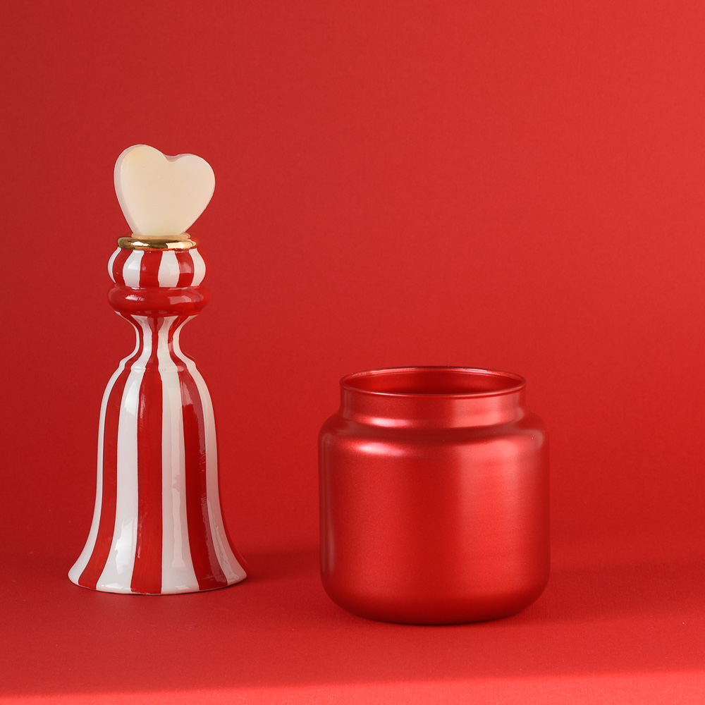 Wykonany z dbałością o każdy szczegół, pojemnik w intensywnym, czerwonym metaliku zachwyca swoim lśniącym blaskiem i wyrafinowanym designem. Stanowi doskonałą bazę dla świec, które mają być nie tylko źródłem światła, ale i ozdobą wnętrza. Jego luksusowy wygląd wpisuje się w klimat walentynkowej kolekcji, dodając magii każdej chwili. Idealny na romantyczny prezent lub jako wyjątkowy akcent dekoracyjny.