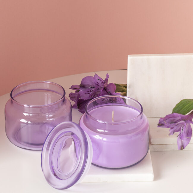 Pojemnik na świece z pokrywką – transparentny pastelowy fiolet