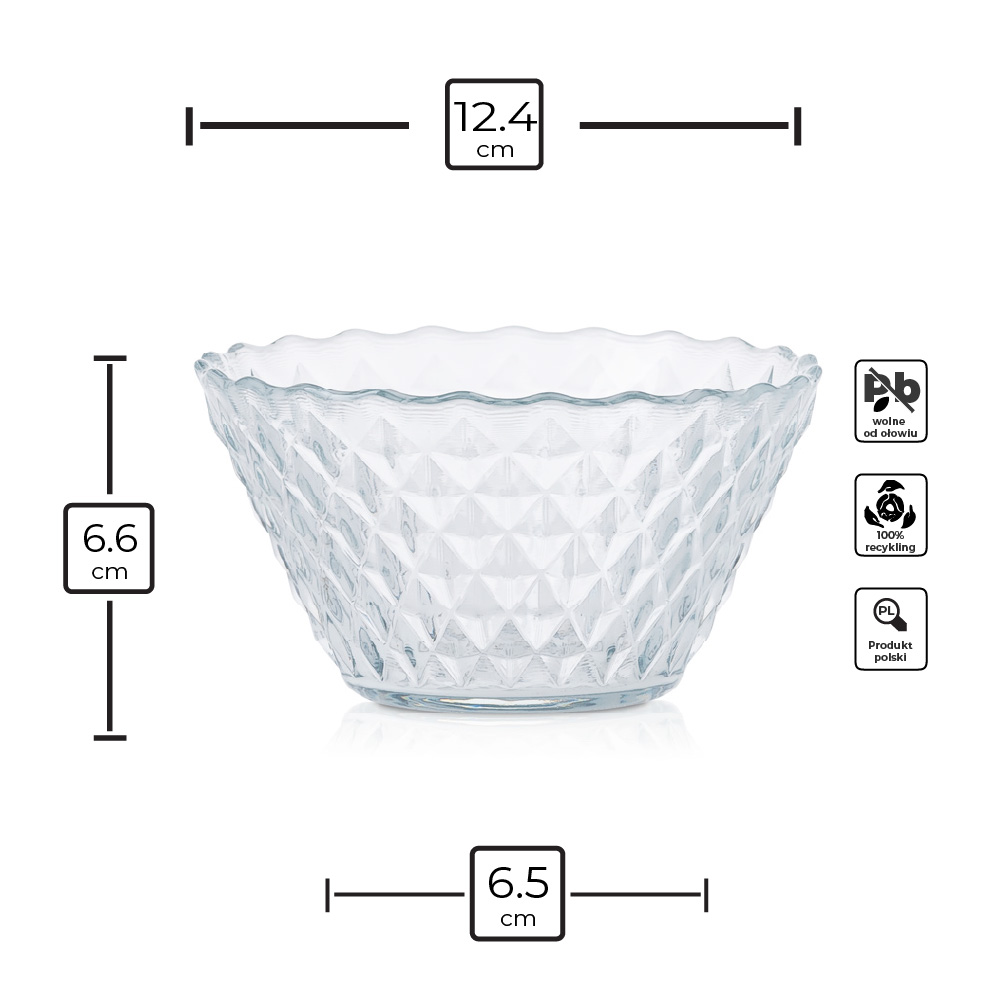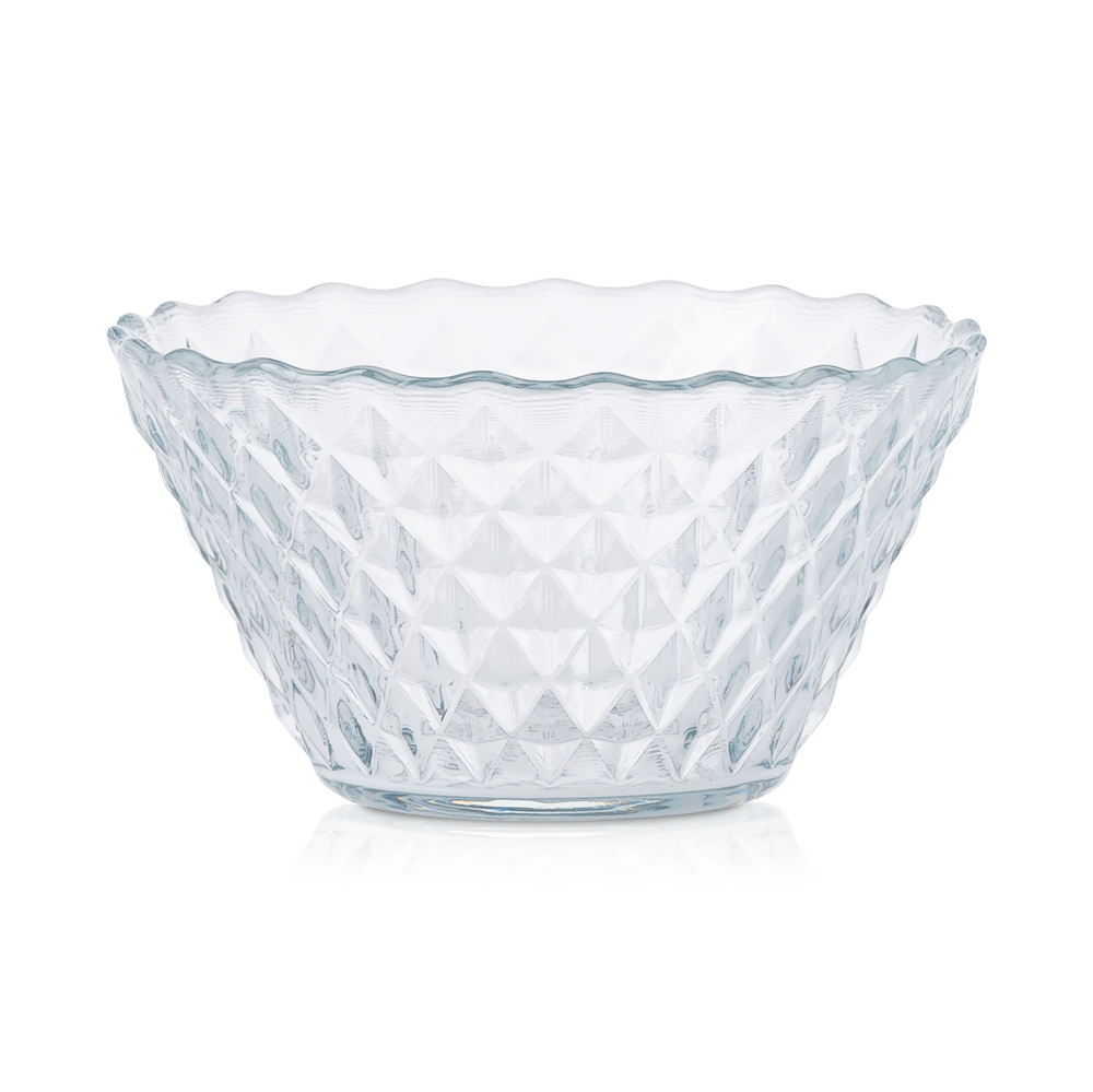 Nasza elegancka miska to nie tylko zwykła miska, to detal, który buduje atmosferę. Jej kryształowa forma i geometryczna faktura pięknie załamują światło, wprowadzając do wnętrza delikatny połysk i poczucie wyrafinowania.Falowany brzeg dodaje jej lekkości i ponadczasowego uroku – idealnie komponuje się zarówno z klasyczną porcelaną, jak i nowoczesnym, minimalistycznym szkłem. To doskonały element dekoracyjny, który sprawdzi się na stole – można w niej podać owoce, desery czy drobne przekąski. To naczynie, które łączy funkcjonalność z estetyką, stając się subtelnym, ale efektownym akcentem każdego wnętrza.