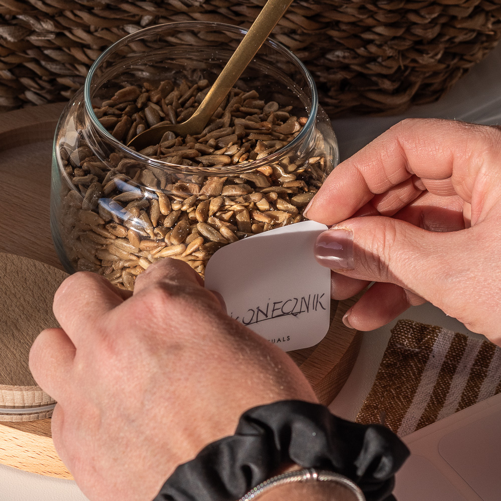 Puste pola pozwalają własnoręcznie opisać każdy pojemnik – od przypraw i ziół, po mąki, kasze czy orzechy. To idealny wybór dla osób, które lubią mieć wszystko uporządkowane, ale po swojemu.