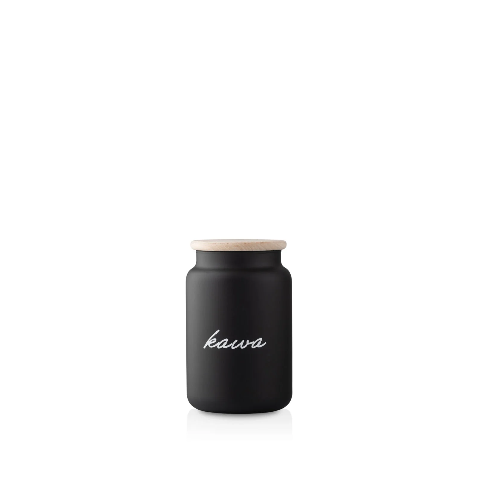 Na pojemniku znajduje się biały napis “kawa” wykonany kursywą.