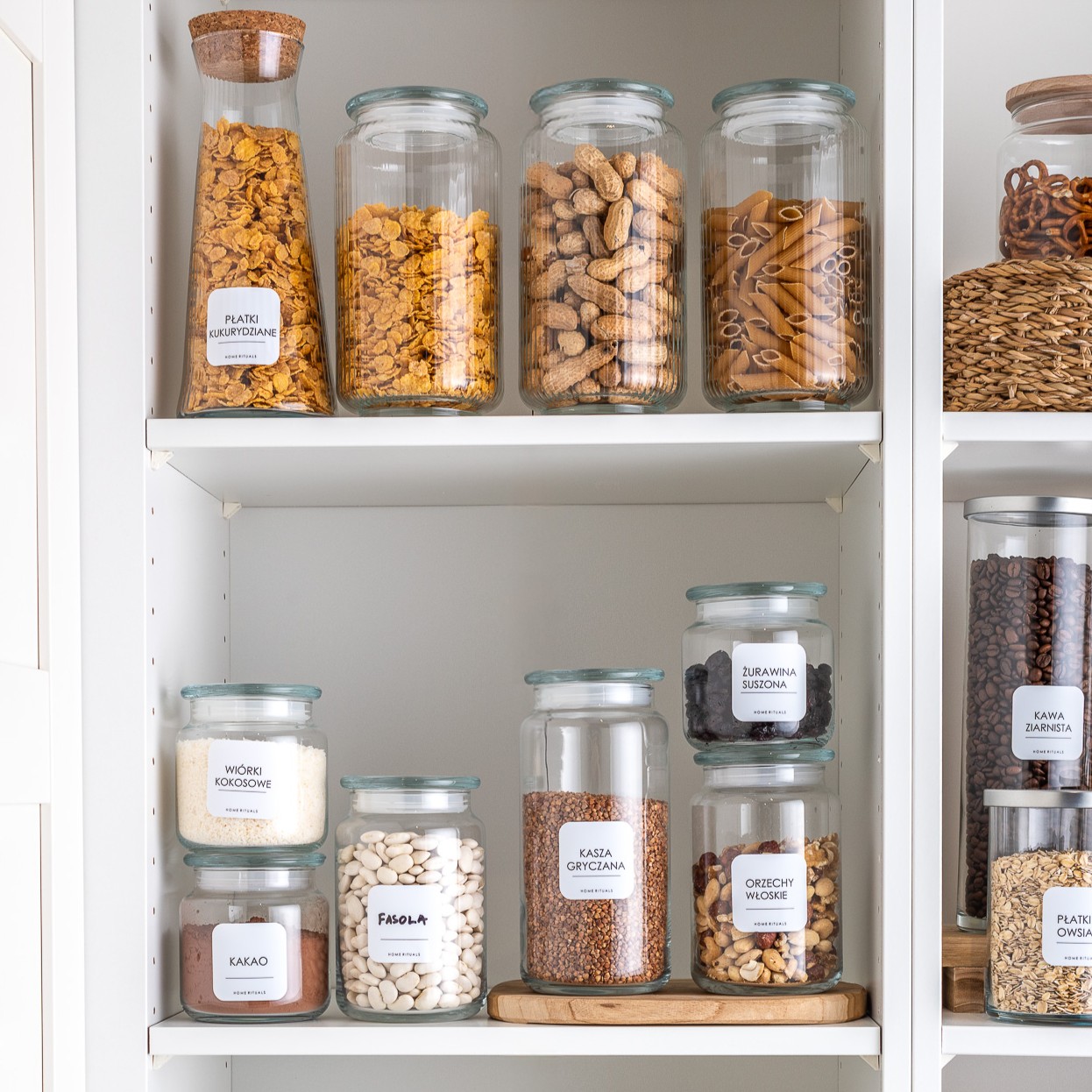 Aby ułatwić organizację, kolekcję PURE można uzupełnić o eleganckie naklejki, które pozwalają szybko odnaleźć odpowiednie składniki i i dobrze zorganizować domową spiżarnię.