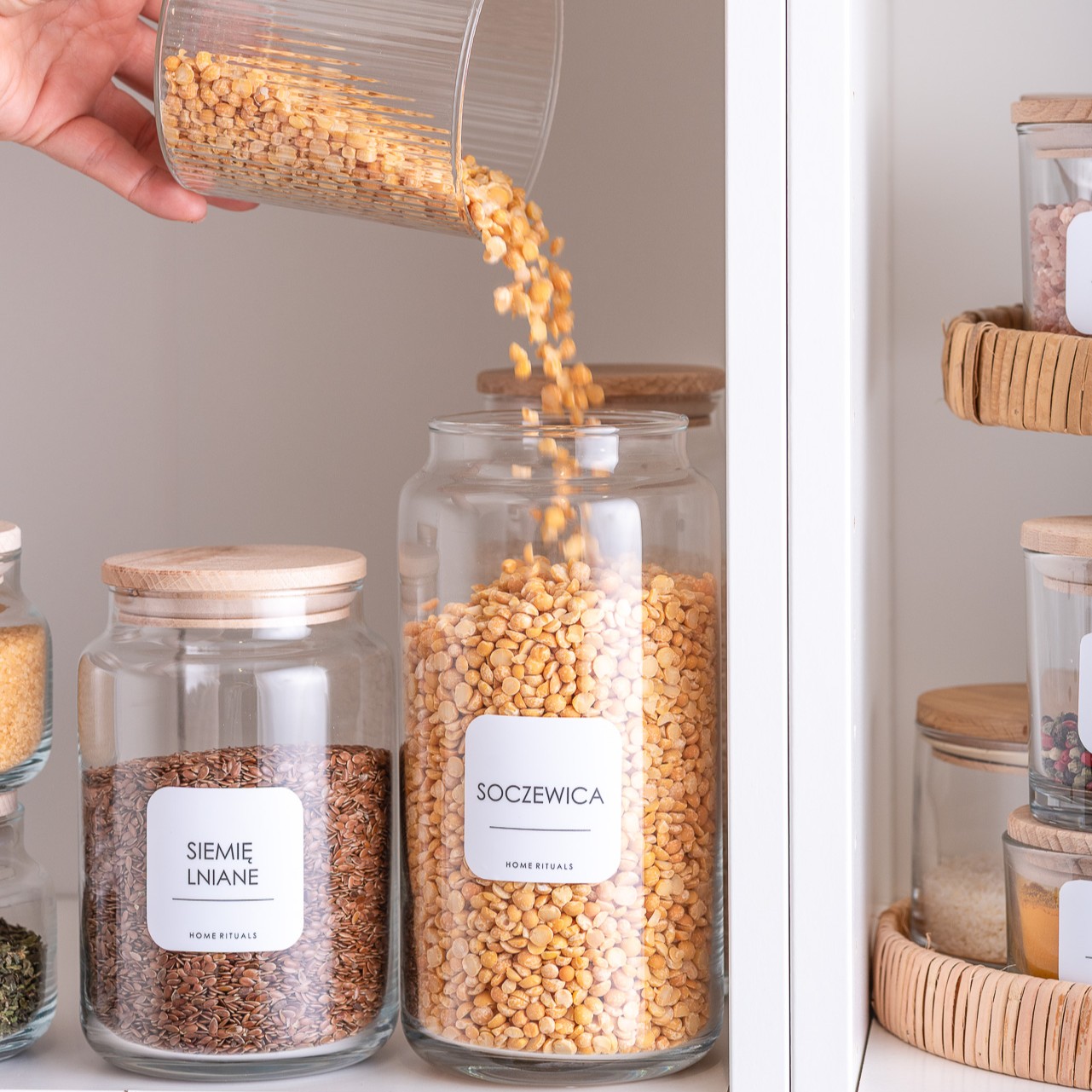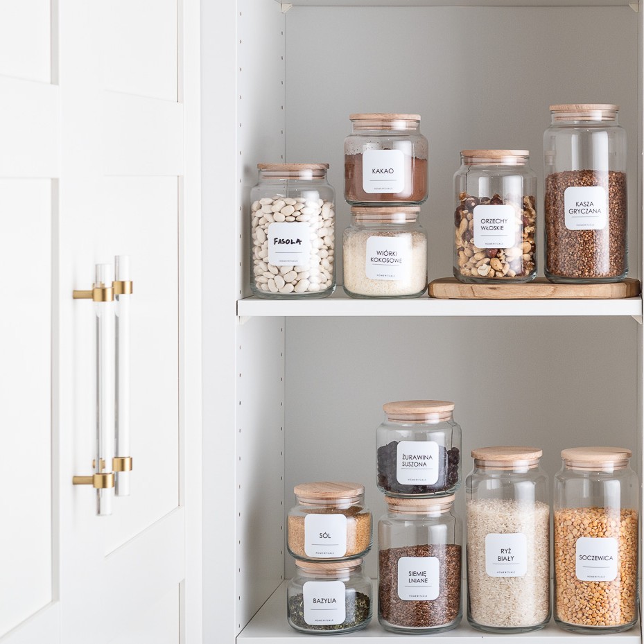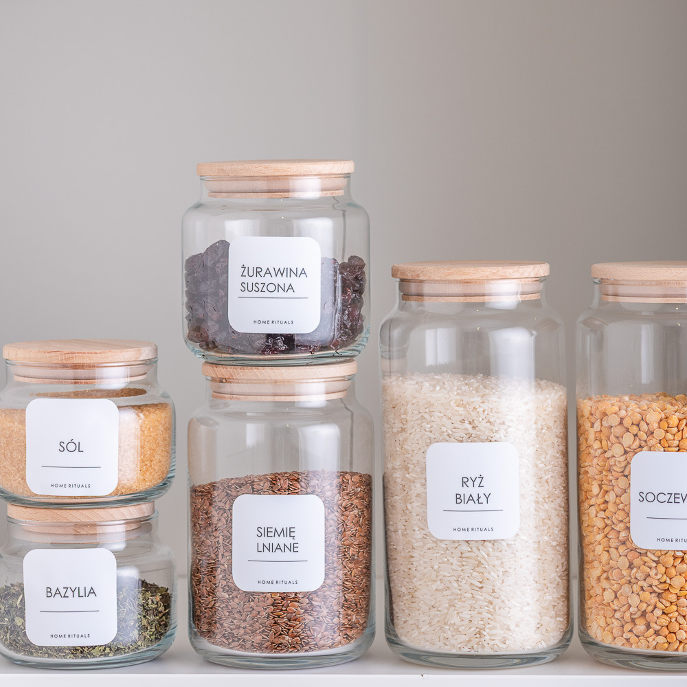 Aby ułatwić organizację, kolekcję PURE można uzupełnić o eleganckie naklejki, które pozwalają szybko odnaleźć odpowiednie składniki i i dobrze zorganizować domową spiżarnię.