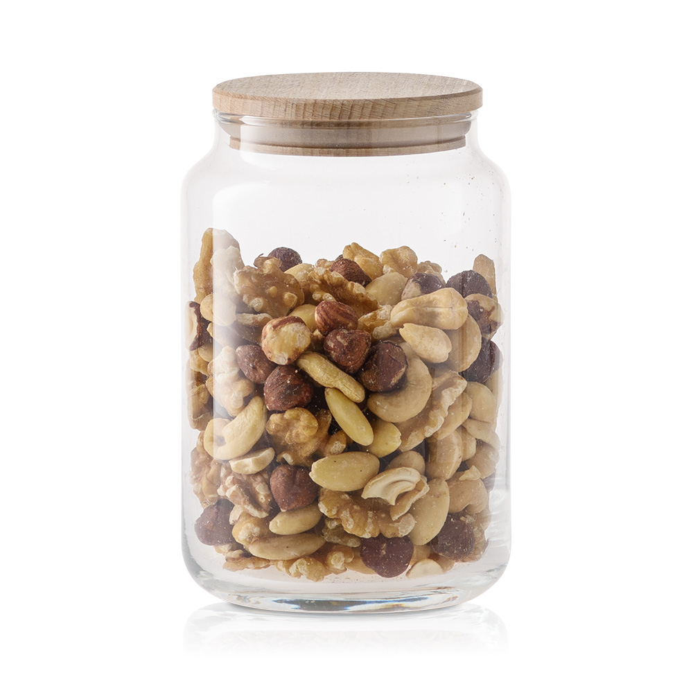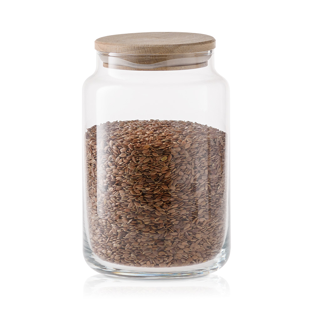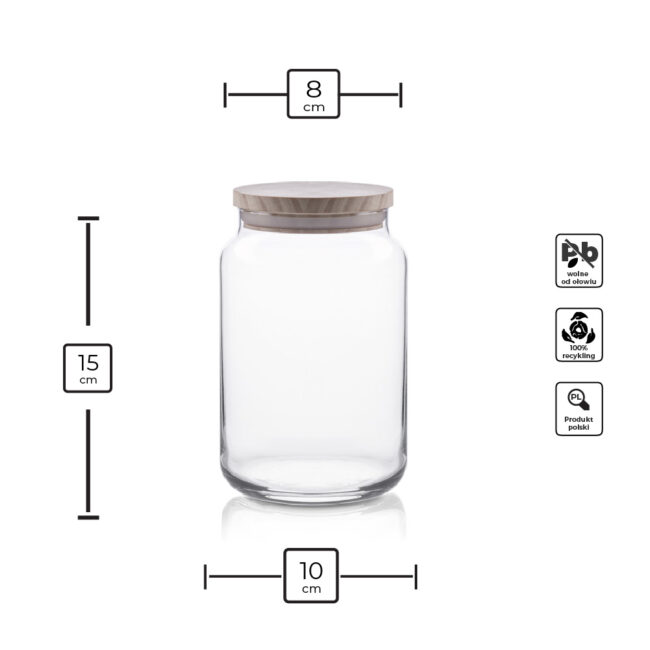 Praktyczny i elegancki szklany pojemnik do przechowywania z deklem drewnianym to doskonałe rozwiązanie do przechowywania różnorodnych produktów spożywczych. Jego uniwersalna, cylindryczna forma sprawia, że pasuje do każdej kuchni, a przezroczyste szkło pozwala na szybkie sprawdzenie zawartości.