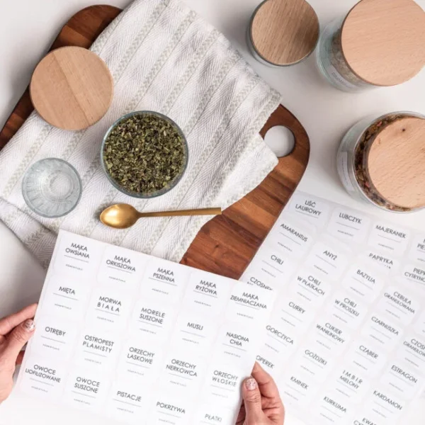 Oferujemy gotowe zestawy z popularnymi przyprawami i produktami spożywczymi, a także kilka pustych etykiet, które możesz opisać samodzielnie – idealne, gdy chcesz dodać coś od siebie.