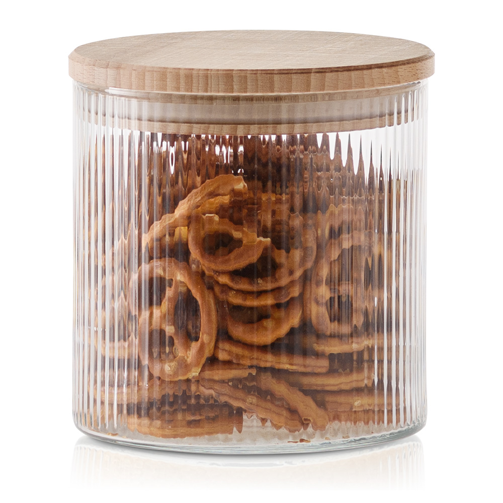 Praktyczny i elegancki szklany pojemnik do przechowywania z deklem drewnianym to doskonałe rozwiązanie do przechowywania różnorodnych produktów spożywczych. Jego uniwersalna, cylindryczna forma sprawia, że pasuje do każdej kuchni, a przezroczyste szkło pozwala na szybkie sprawdzenie zawartości.