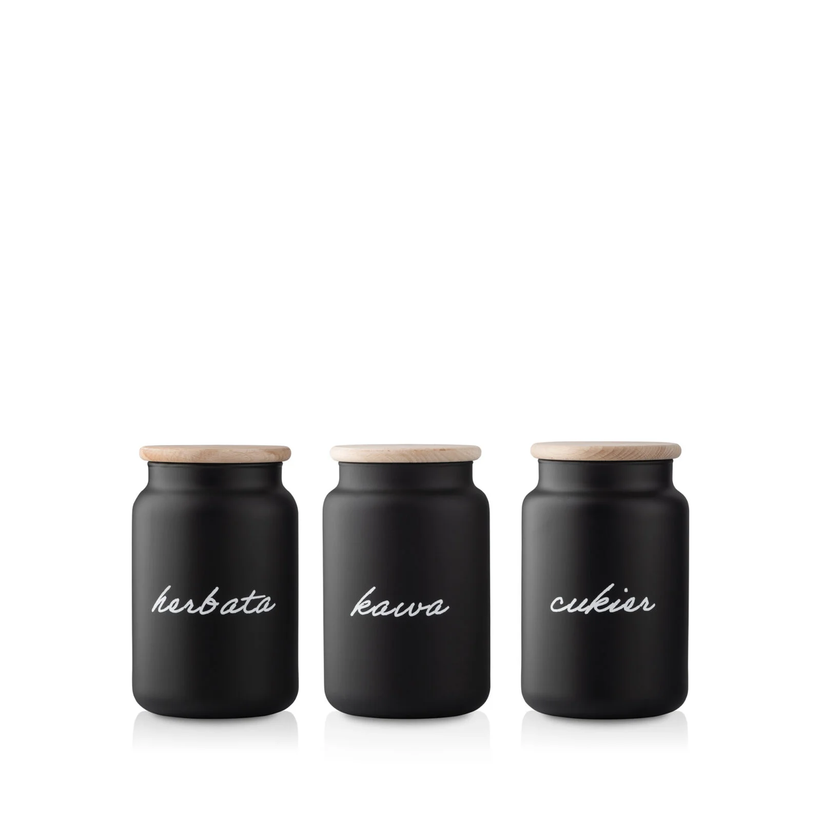 Na każdym pojemniku znajduje się biały napis wykonany kursywą, co dodaje im jeszcze większego stylu i elegancji. Do kompletu dołączone są trzy drewniane dekle z uszczelką, które skutecznie chronią przechowywane produkty przed wilgocią i wysuszeniem. Dzięki temu można zachować ich świeżość i aromat na dłużej.