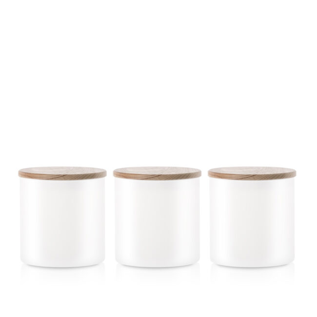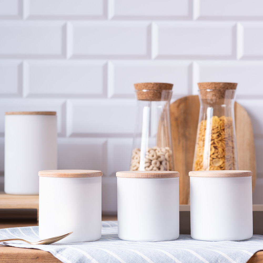 Praktyczny zestaw szklanych pojemników do przechowywania w kolorze białego matu z deklem drewnianym to doskonałe rozwiązanie do przechowywania różnorodnych produktów spożywczych. Jego uniwersalna, cylindryczna forma sprawia, że pasuje do każdej kuchni.
